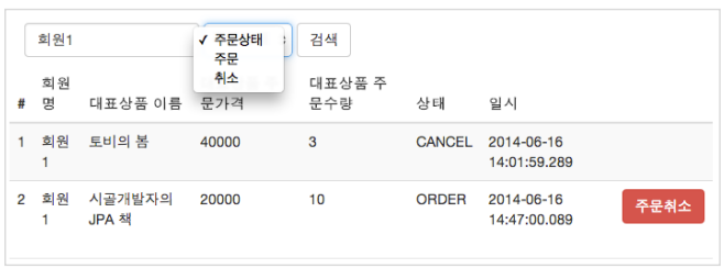 - 주문 취소 cancel() : getItem().addStock(count) 를 호출해서 취소한 주문 수량만큼 상품의 재고를 증가시킨다.