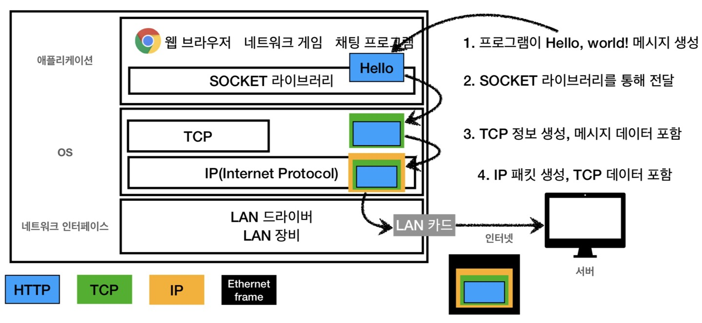 위의 그림을 보면 위에서 배운 IP 패킷 안에 TCP, HTTP 패킷이 포함되어 있다.