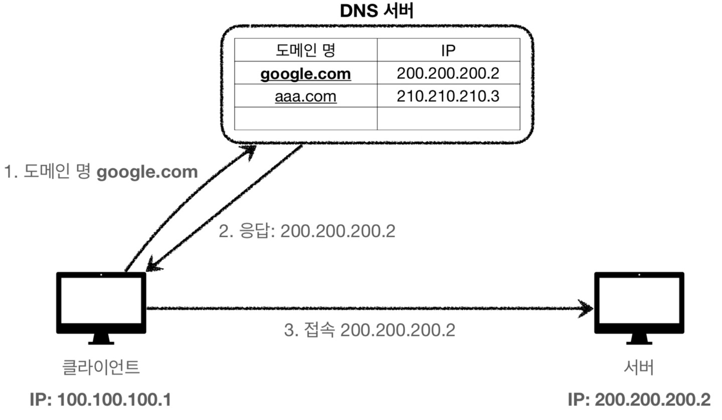 2. 클라이언트는 도메인 명(구글)로 DNS서버에 요청하면 DNS서버는 해당 도메인의 IP를 응답값으로 준다.