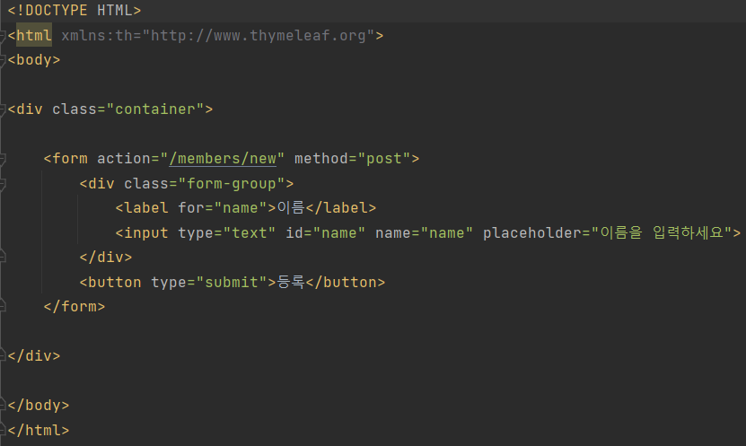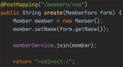 - <form action="/members/new" method="post"> 에서 /members/new 이 URL로 post방식으로 입력한 spring이 넘어온다.