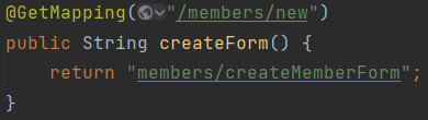 3. 이 코드로 들어오게 되고 이 코드가 매핑이 되는데 이것은 별 다른 기능을 하는 것 없이 member/createMemberForm으로 이동하게 된다.