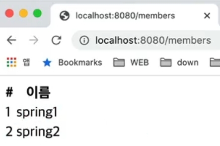 - 2명의 회원을 입력하였으니 th:each를 통해 루프를 돌면서 로직을 실행하여 객체 2개가 출력되는 것이다.