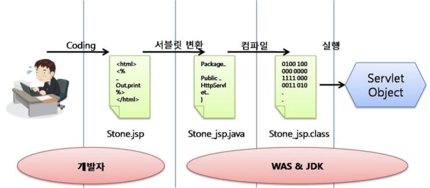 자바 파일에서 HTML을 코딩하기 번거롭고 불편해서 HTML 내부에 java 코드를 삽입하는 형식이 JSP이다. 다시 말해 서블릿의 단점을 보완하고자 만든 서블릿 기반의 스크립트 기술이다. 서블릿을 이용하게 되면 웹 프로그래밍을 할 수 있지만 자바에 대한 지식이 필요하며 화면 인터페이스 구현에 너무 많은 코드를 필요로 하는 등 비효율적인 측면들이 있다. 때문에 서블릿을 작성하지 않고도 간편하게 웹 프로그래밍을 구현하게 만든 기술이 JSP(Java Server Pages)이다.